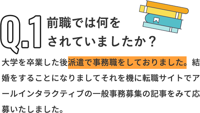 | 研修 | <研修は2ヶ月> 入社後、2か月は上長と共に一般事務と受電業務を行います。先輩が丁寧にやさしくお教えいたしますので安心してください。とても和やかな職場です。 |